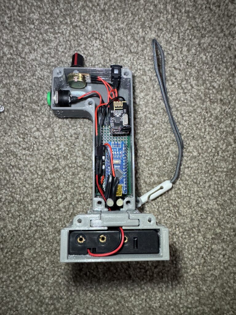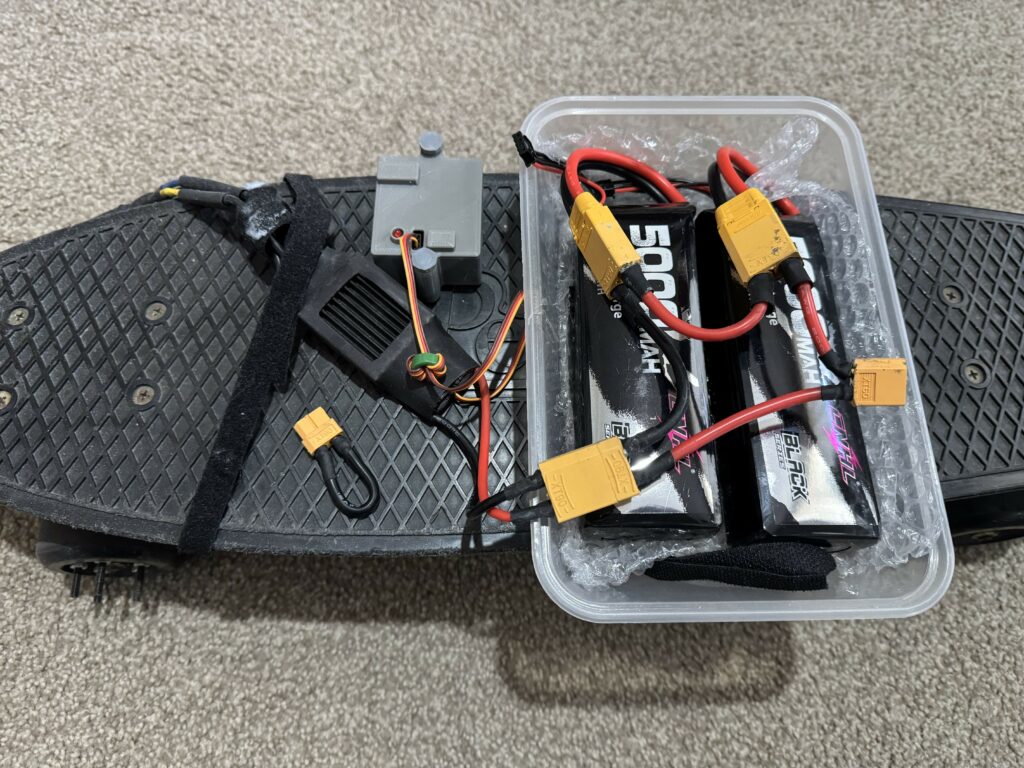Initially a drone radio transmitter was used to control the electric skateboard. However, it was not in a form easily used while riding a skateboard, so a custom radio controller and receiver was designed using 3D printed parts and custom electronics. Images of the custom controller and receiver is shown below.
