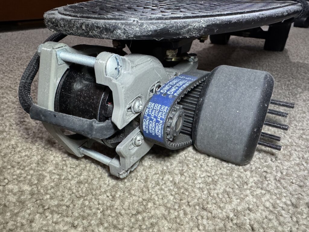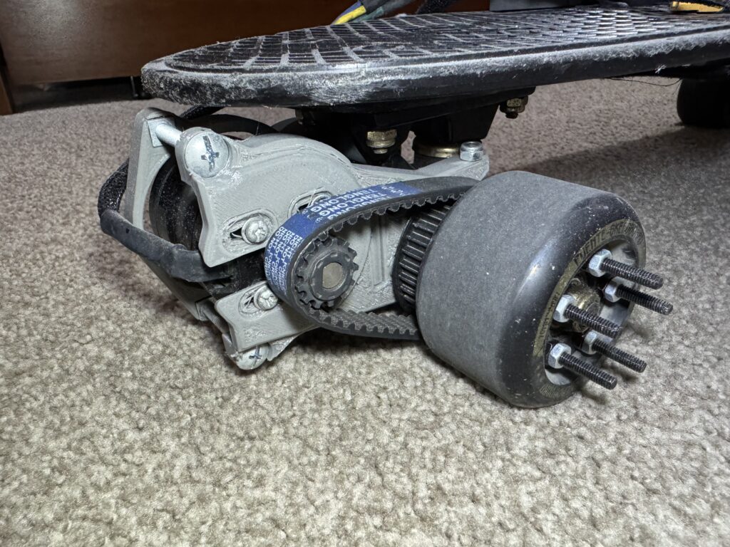 Wanting to make a personal transportation system, I modified a Penny skateboard to be powered by an electric motor. Many factors had to be considered, such as wheel diameters, gear ratios, motor specifications, battery type, and whether these choices would still give enough clearance between the pulley system and the ground, and if the system would still provide sufficient torques. Images of the design is shown below.